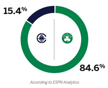 快船和凱爾特人目前都取得五連勝,并列聯(lián)盟最長連勝,ESPN預(yù)測本場凱爾特人勝率高達84.6%,快船僅為15.4%。