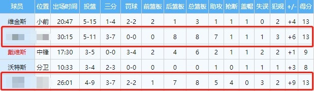 數據1:出場30分15秒,11投5中(三分7中3),得到13分8籃板7助攻1搶斷1蓋帽,正負值+6;