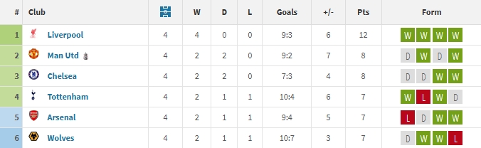曼聯(lián):2勝2平 第2(凈勝球7)