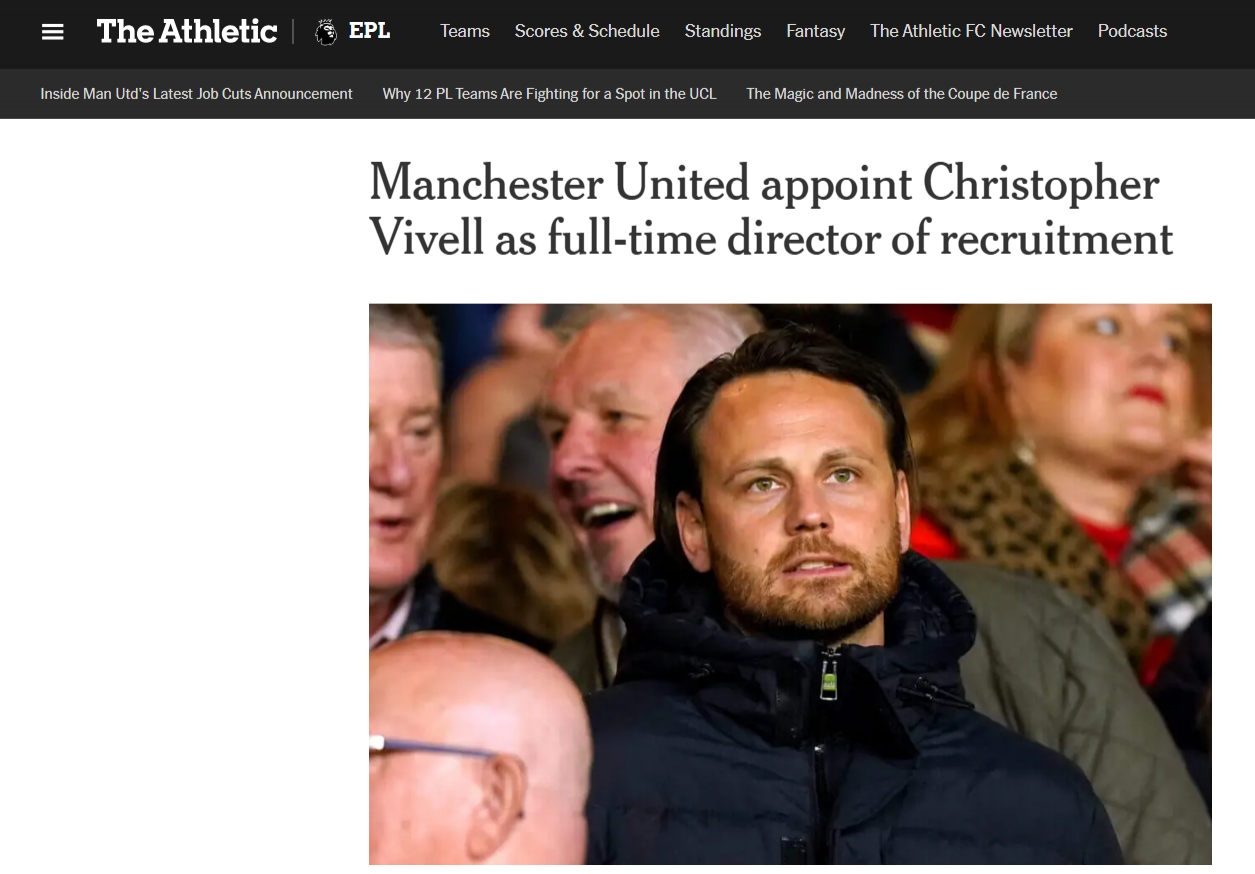 2月25日訊 據(jù)《Theathletic》報(bào)道,曼聯(lián)任命克里斯托弗-維維爾(Christopher Vivell)為全職招聘總監(jiān),此前他曾臨時(shí)擔(dān)任該職位。