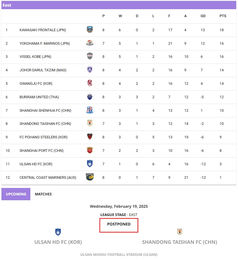 目前亞足聯(lián)官網(wǎng)還未更新東區(qū)積分榜,蔚山HDvs山東泰山的比賽顯示也是postponed(推遲)而非取消。