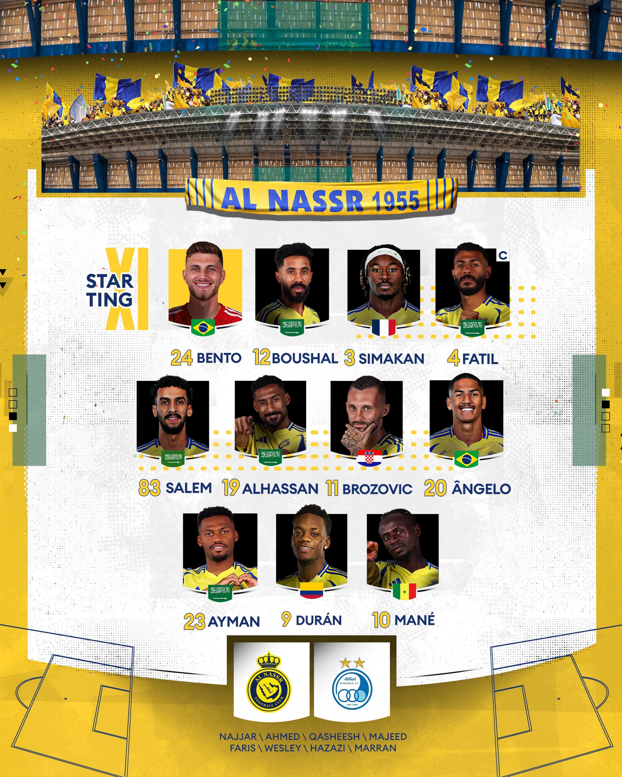 利雅得勝利首發(fā):24-本托、3-西馬坎、4-法蒂爾、12-納瓦夫、83-納吉迪、19-哈桑、11-布羅佐維奇、23-葉海亞、20-安吉洛、10-馬內(nèi)、9-杜蘭