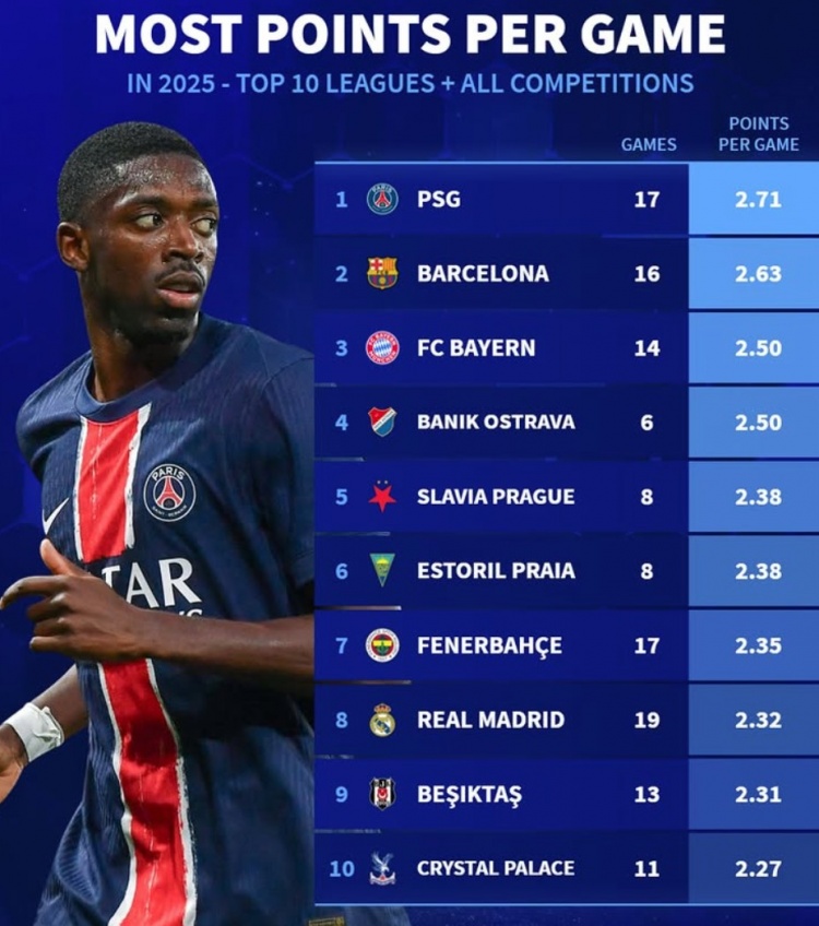 3月8日訊 《轉(zhuǎn)會市場》統(tǒng)計了歐足聯(lián)排名前十聯(lián)賽的球隊在2025年各項賽事場均拿分情況,巴黎領(lǐng)跑。