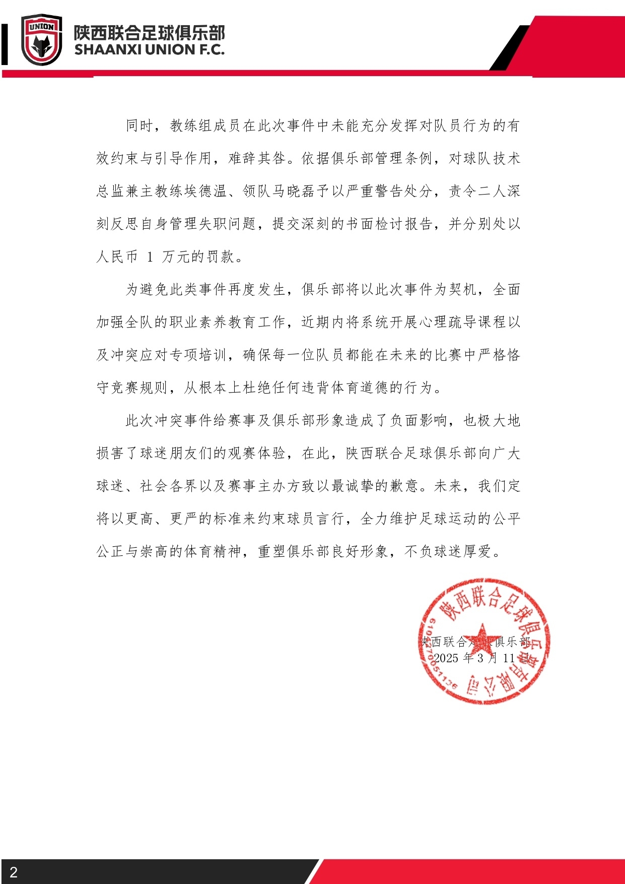 同時,教練組成員在此次事件中未能充分發(fā)揮對隊(duì)員行為的有效約束與引導(dǎo)作用,難辭其咎。依據(jù)俱樂部管理?xiàng)l例,對球隊(duì)技術(shù)總監(jiān)兼主教練埃德溫、領(lǐng)隊(duì)馬曉磊予以嚴(yán)重警告處分,責(zé)令二人深刻反思自身管理失職問題,提交深刻的書面檢討報告,并分別處以人民幣1萬元的罰款。
