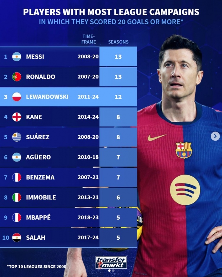 2025-02-19 19:50:12德轉(zhuǎn)列新世紀聯(lián)賽單賽季進球20+次數(shù):梅西&C羅13次,萊萬12次