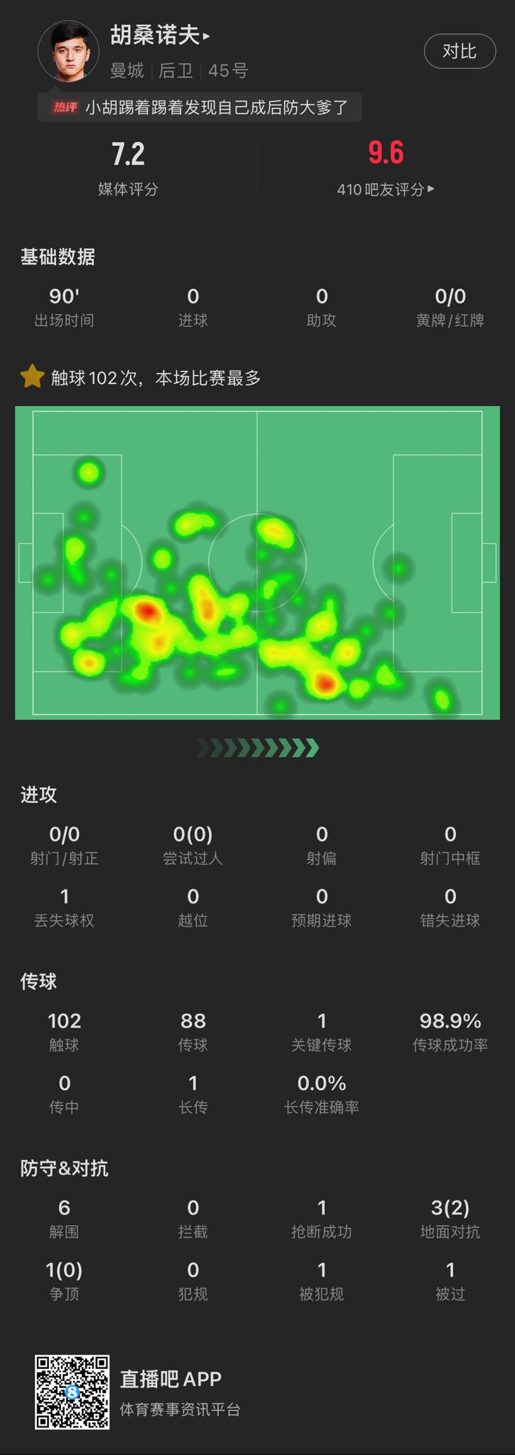 2025-02-24 12:03:06胡桑諾夫數(shù)據(jù):傳球成功率98.9% 6次解圍 媒體評(píng)分7.2分
