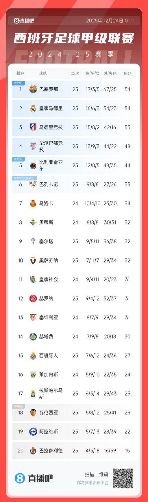 2025-02-24 12:03:17爭(zhēng)冠白熱化!西甲積分榜:巴薩、皇馬同分排1、2,馬競(jìng)落后1分第3