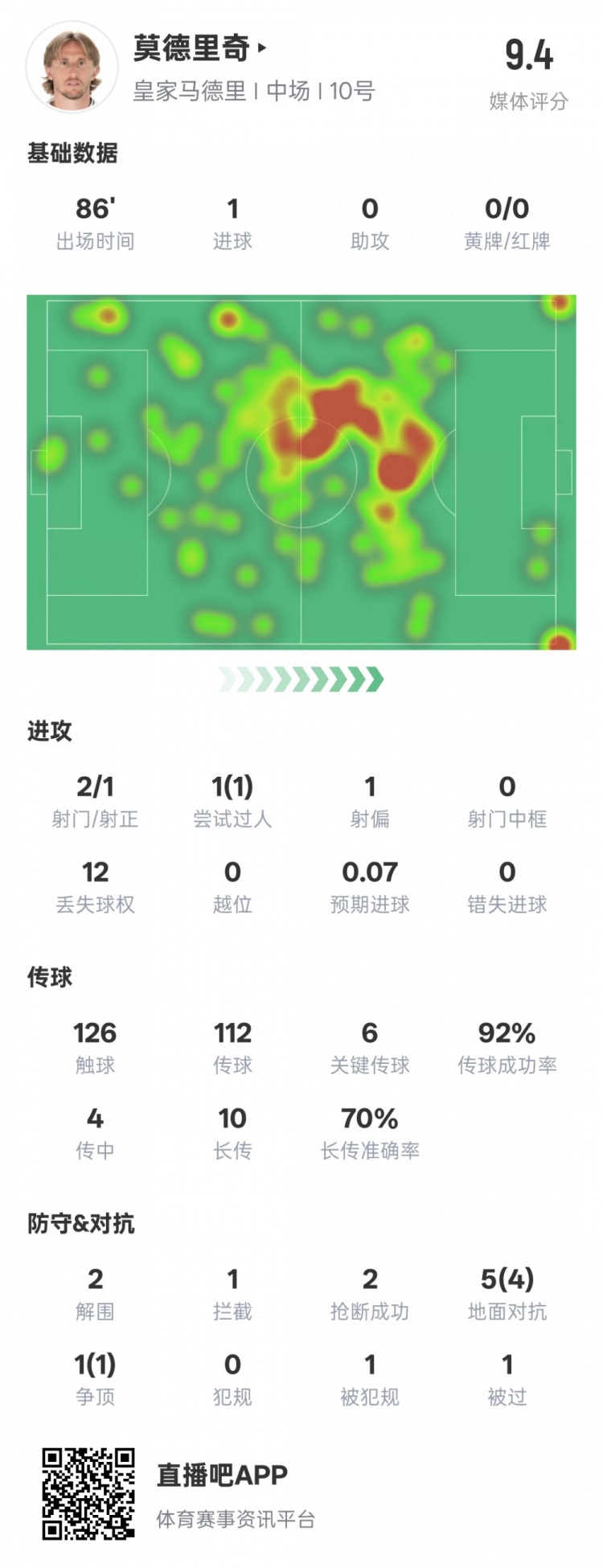2025-02-24 12:03:19莫德里奇本場比賽數(shù)據(jù):1進(jìn)球6關(guān)鍵傳球2解圍2搶斷,評分9.4