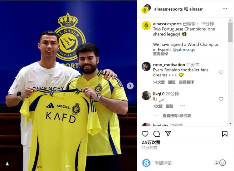 利雅得勝利電競分部簽下了EA FC世界冠軍若昂-阿方索,俱樂部社媒曬出若昂-阿方索與C羅的合照,官方宣布這位葡萄牙電競選手加盟。