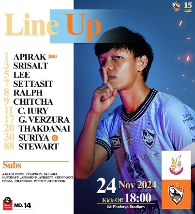 11月24日訊 本輪泰超,清萊聯(lián)客場對陣農(nóng)布阿皮查亞。中國球員郭田雨并未進入清萊聯(lián)本場比賽名單,這也是他連續(xù)第二場無緣名單。