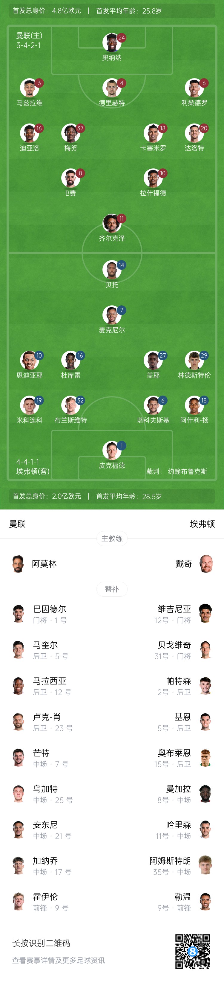 曼聯(lián)首發(fā):24-奧納納、4-德里赫特、6-利桑德羅-馬丁內(nèi)斯、3-馬茲拉維、20-達(dá)洛特、18-卡塞米羅、37-梅努、16-阿瑪?shù)隆?-B費、10-拉什福德、11-齊爾克澤